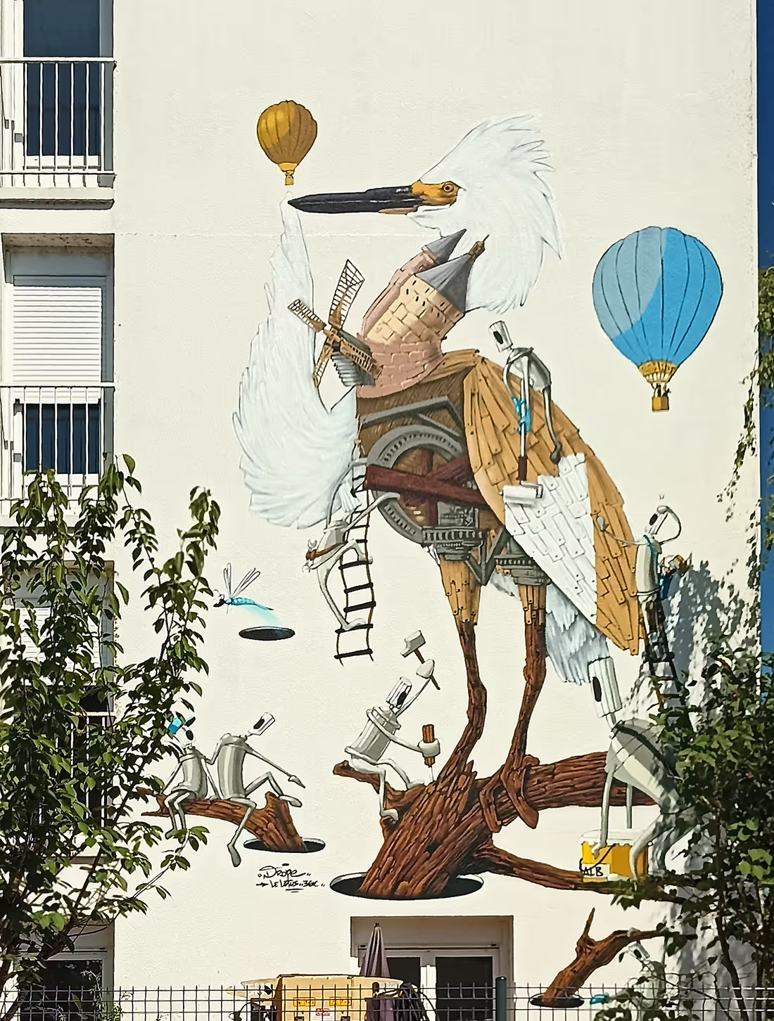 On y découvre une aigrette garzette singulière, dont le corps hybride mêle nature et patrimoine : des éléments de châteaux et de moulins ligériens sʼintègrent à son plumage et à son cou, évoquant le riche passé architectural de la région. Ses ailes, encore en construction, sont façonnées en bois par de petits personnages en forme de bombes de peinture, symboles dʼun art en devenir, collectif et vivant.