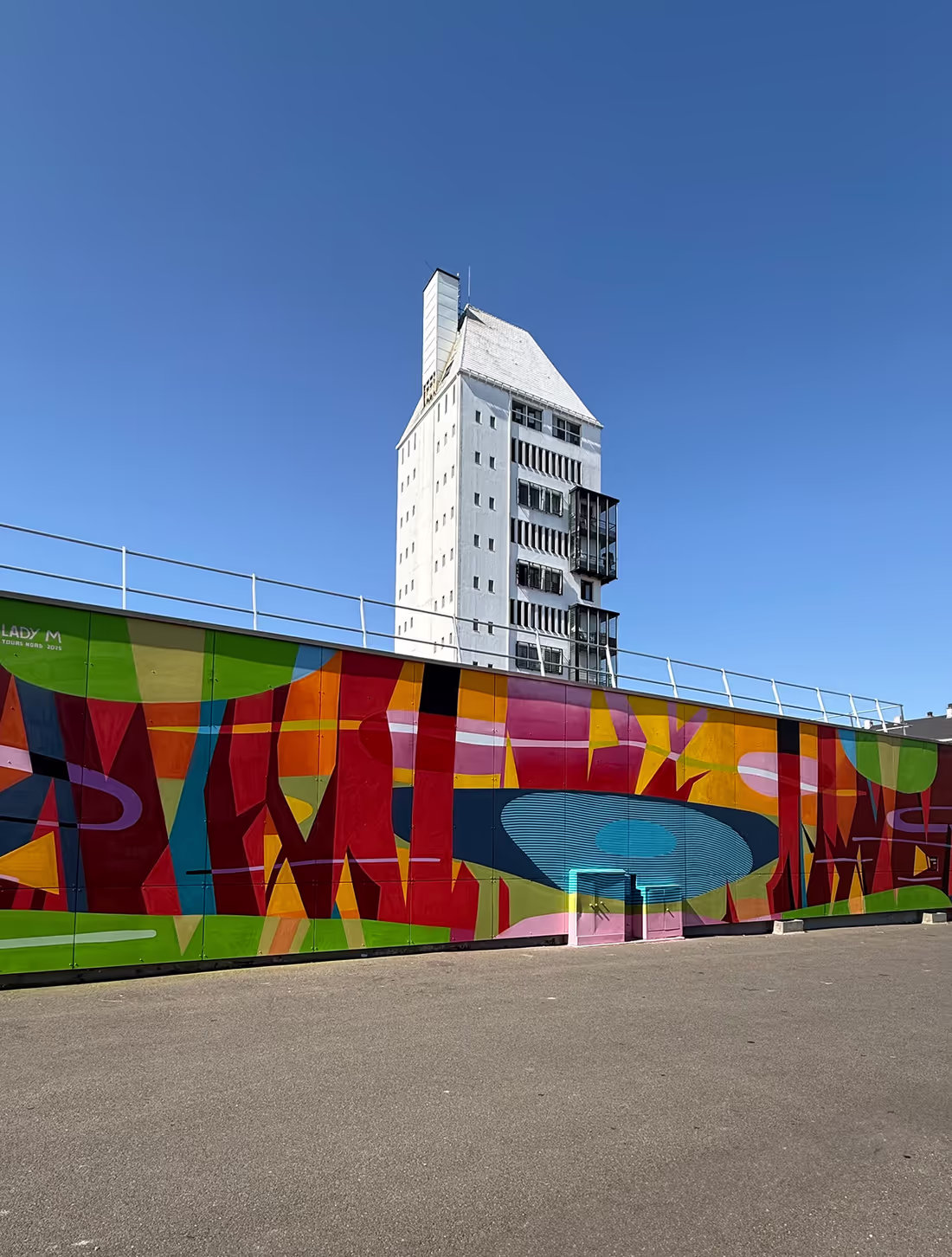 Cette fresque « Ode à la nature » évoque un paysage imaginaire où la nature revêt une dimension presque surnaturelle. Ses éléments, déclinés en formes abstraites et graphiques, imposent leur présence par un jeu audacieux de couleurs, perceptible même de loin.