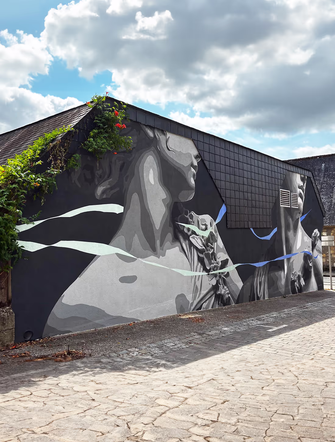 Pour sʼintégrer harmonieusement au quartier, une palette en camaïeu de gris a été choisie, rappelant elle aussi les débuts du cinéma en noir et blanc. Ces deux figures monumentales intègrent la dimension folklorique gargantuesque rabelaisienne puisque la projection des acteurs sur grand écran dépasse littéralement les proportions humaines. Ils deviennent alors des figures colossales, arrachés à lʼordinaire pour les ériger aux rang de divinités modernes. Prémices se veut un pont visuel avec les mythes du passé, nous rappelant que notre époque contemporaine construit elle aussi ses divinités mythiques et iconiques dans les salles obscures.