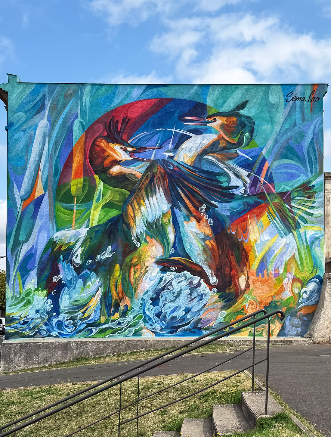 Sema Lao choisit de mettre en scène des oiseaux caractéristiques du bord de Loire, les grèbes huppés. Ils sont représentés ici en parade nuptiale en célébration à la nature et la vie.